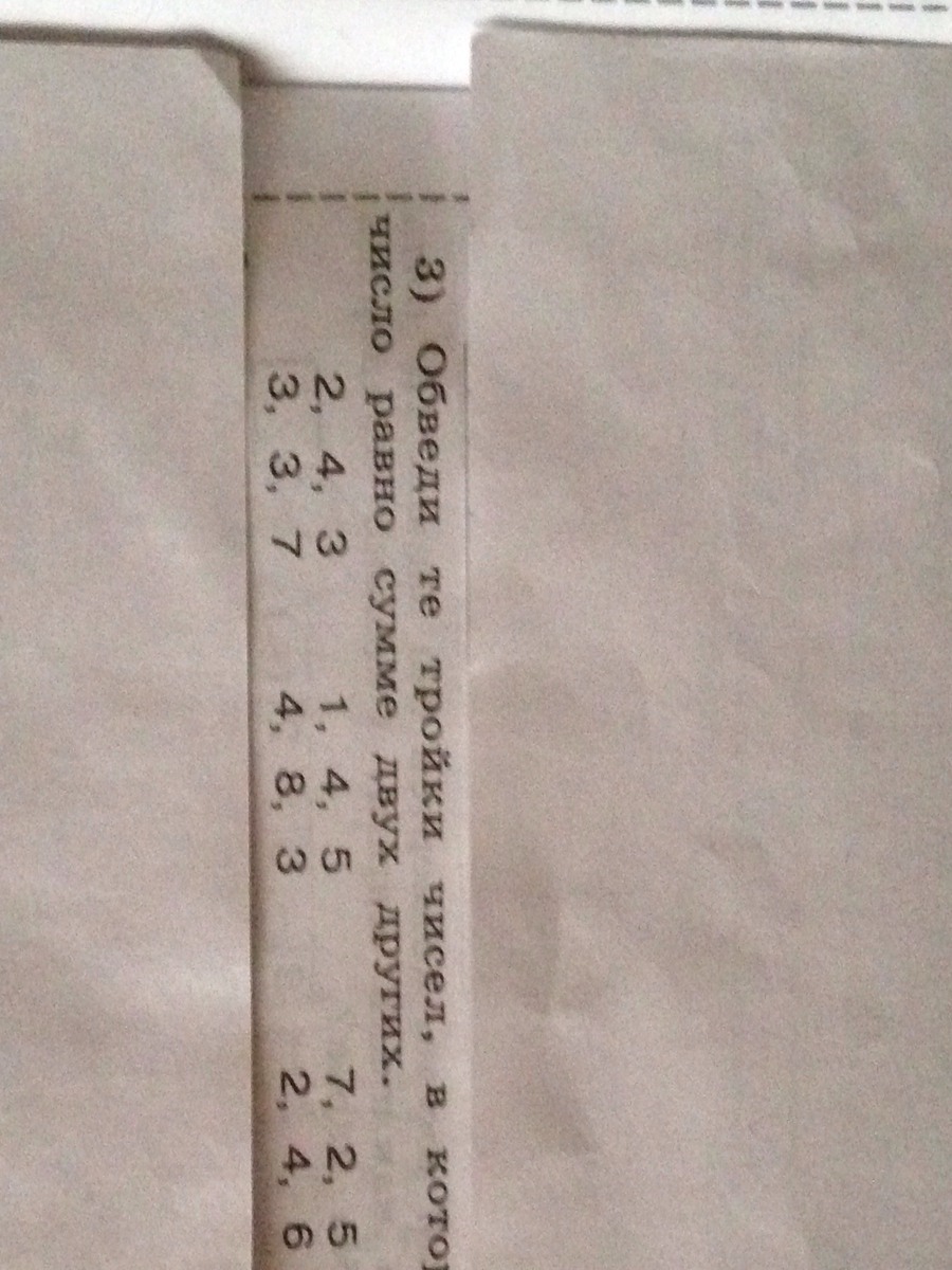 Помогите с задачей. Обведи те тройки чисел, в которых одно число равно сумме двух других.