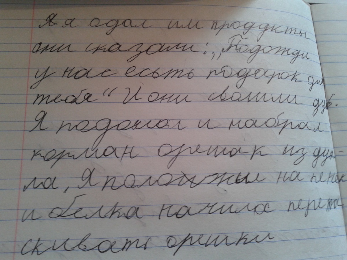 Я отдал им продукты, она сказали: "Подожди, у нас есть подарок для тебя" И они свалили дуб. Я подошел и набрал карман орешек из дупла, я положил их на пенек и белка начала перетаскивать орешки. Так наверное...