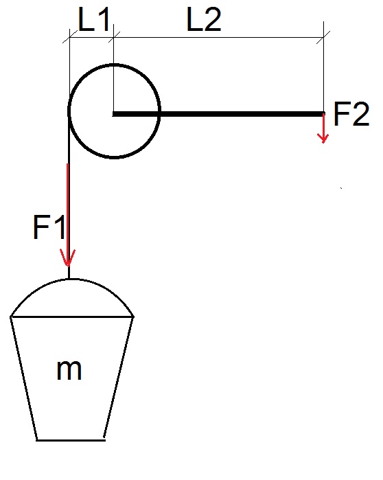 поднять ведро (см.рисунок), момент (M2) силы F2, действующий на рукоятку ворота, должен быть больше или равен моменту (M1), который создает вес (F1) ведра с водой. Т.е. М1 ≤ М2. Или F1*L1 ≤ F2*L2. Отсюда