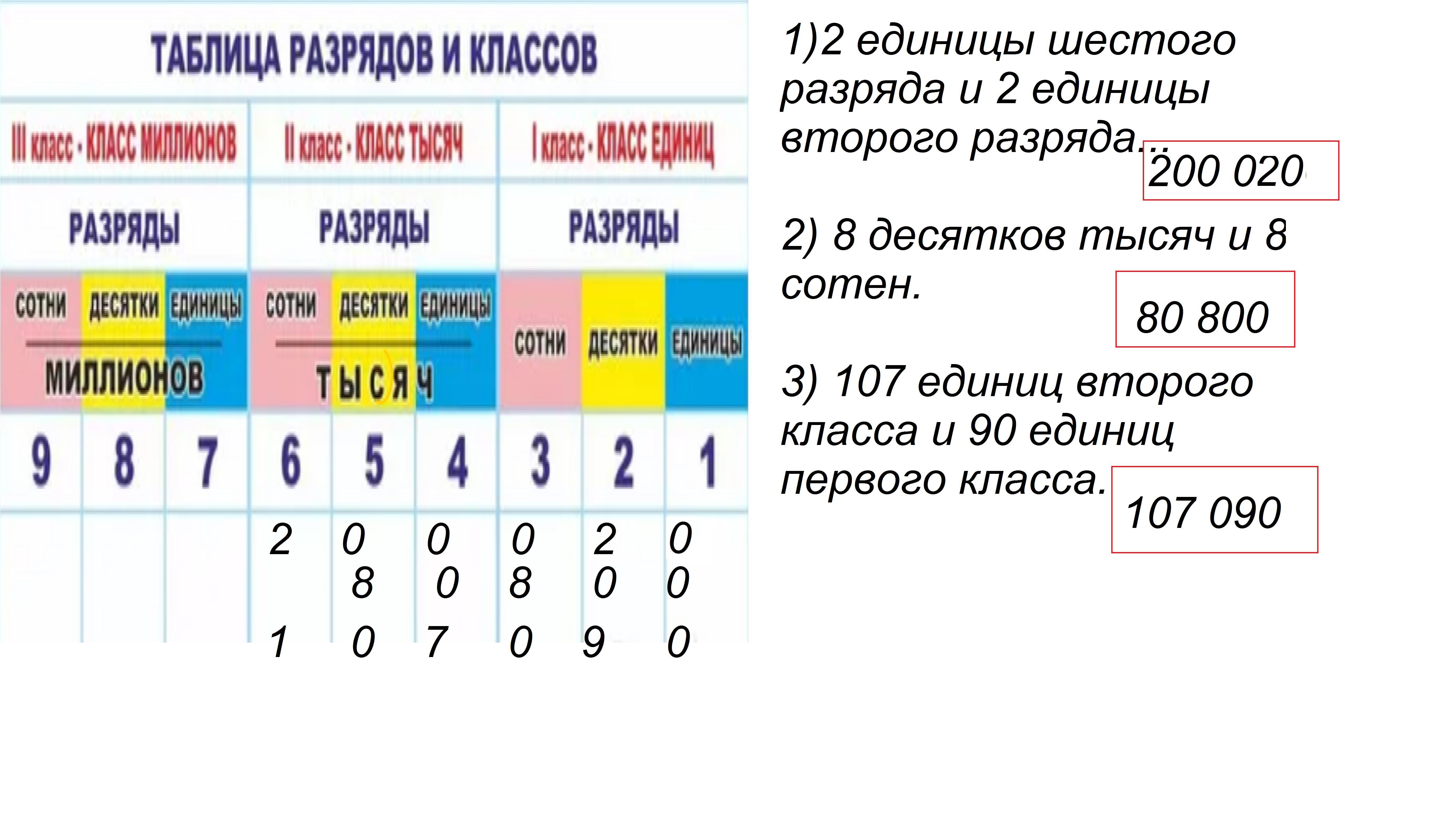 запиши и прочитай число в котором 2 единицы шестого разряда и 2 единицы второго разряда,8 десятков тысяч и 8 сотен, 107 единиц второго класса и 90 единиц первого класса