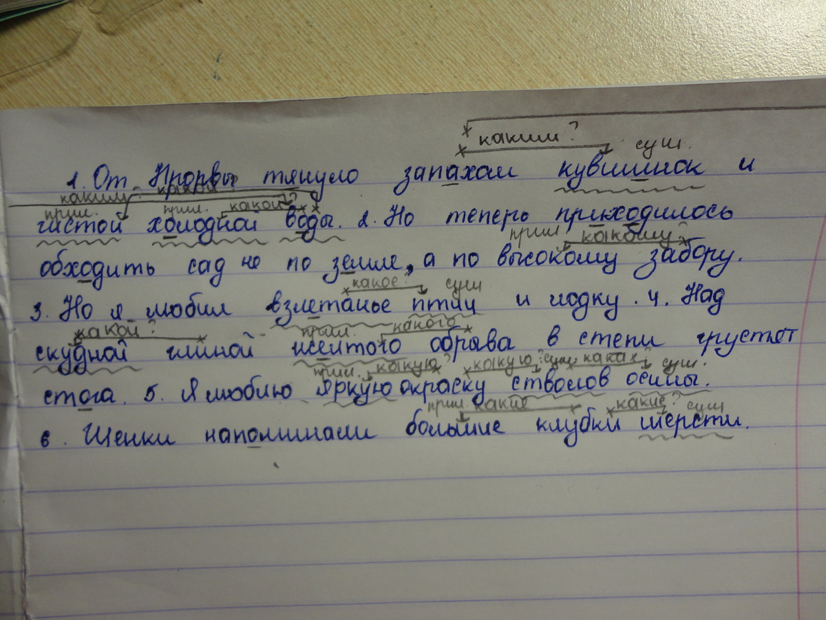 Спиши, вставляя пропущенные буквы и запятые. Найди и подчеркни определения. Укажи, какими частями речи они выражены. Графически покажи их связь со словами, к которым они присоединяются.