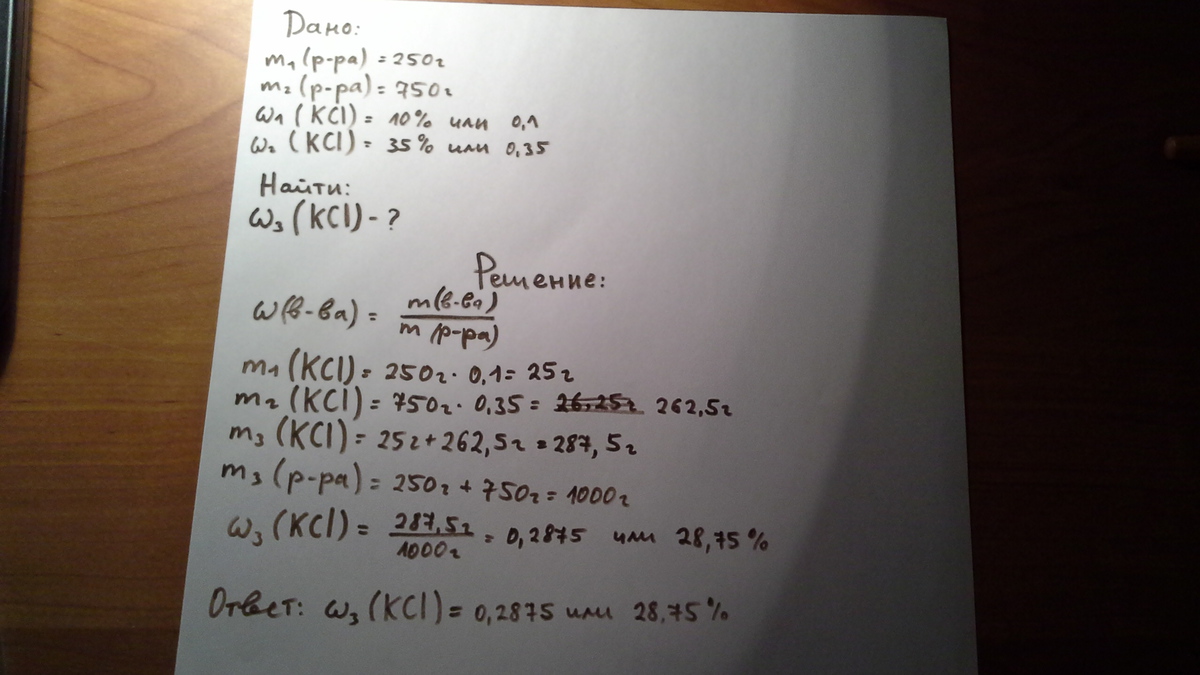 Вычислите массовую долю хлорида калия в растворе, полученном при смешении 250г 10%-процентного и 750г 35%-процентного раствора.