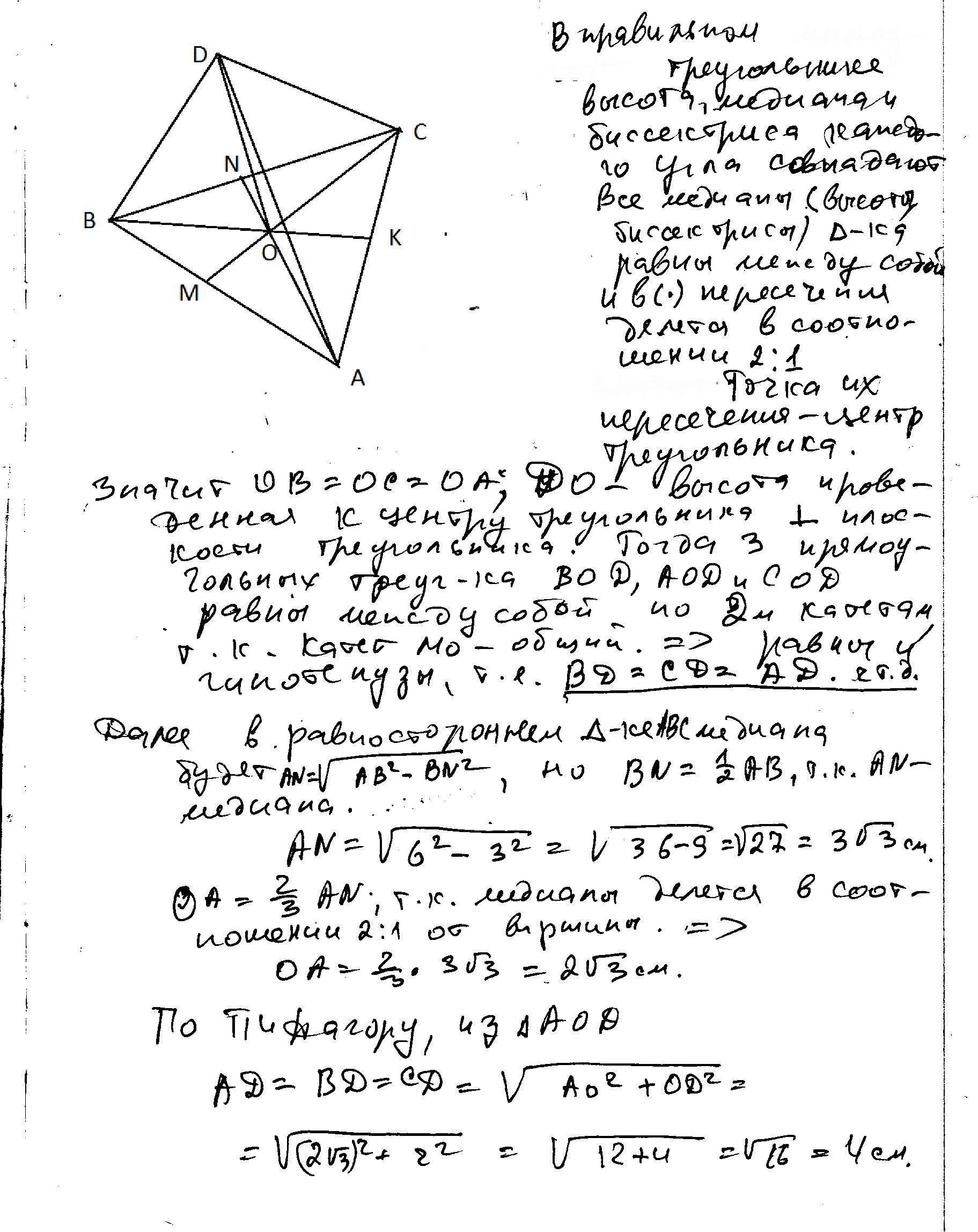 Треугольник ABC - правильный, точка О - центр треугольника ABC. ОМ перпендикулярно плоскости АВС. Доказать, что МА=МВ=МС. Найти: МА, если АВ= 6 см, МО= 2 см.