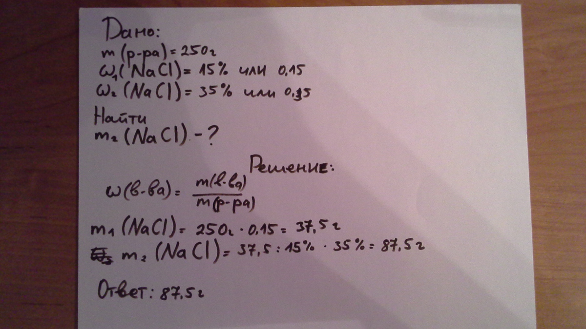 какую массу соли необходимо добавить в 250г 15%-процентного раствора поваренной соли, чтобы получить 35%-ный?