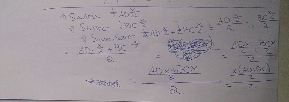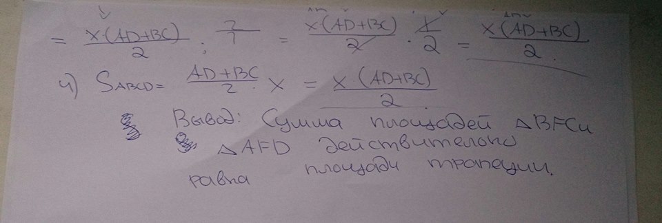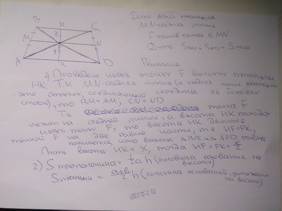 На средней линии трапеции ABCD с основаниями AD и ВС выбрали произвольную точку K. Докажите, что сумма площадей треугольника BKC и AKD равна половине площади трапеции