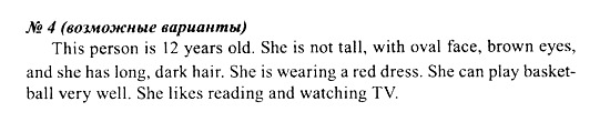Этому человеку 12 лет. Она невысокая, с овальным лицом, карими глазами, и у нее длинные, темные волосы. Она носит красное платье. Она очень хорошо играет в баскетбол. Ей нравится читать и смотреть телевизор.