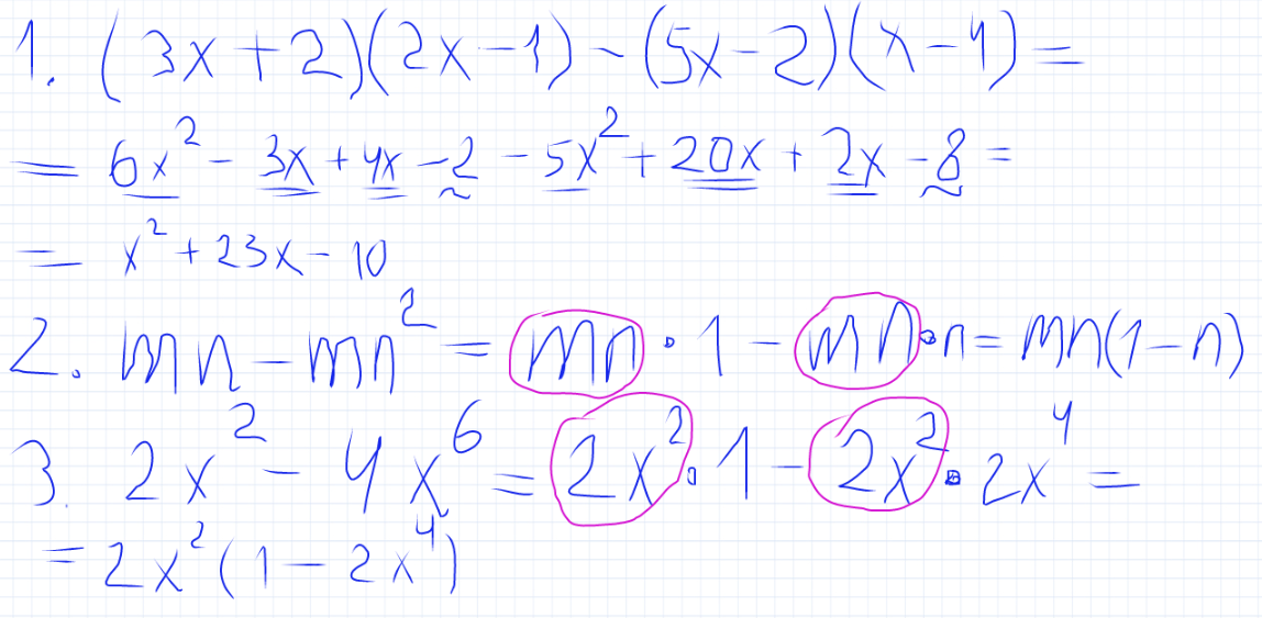 1. Упростите выражение (3x+2)(2x-1)-(5x-2)(x-4)
