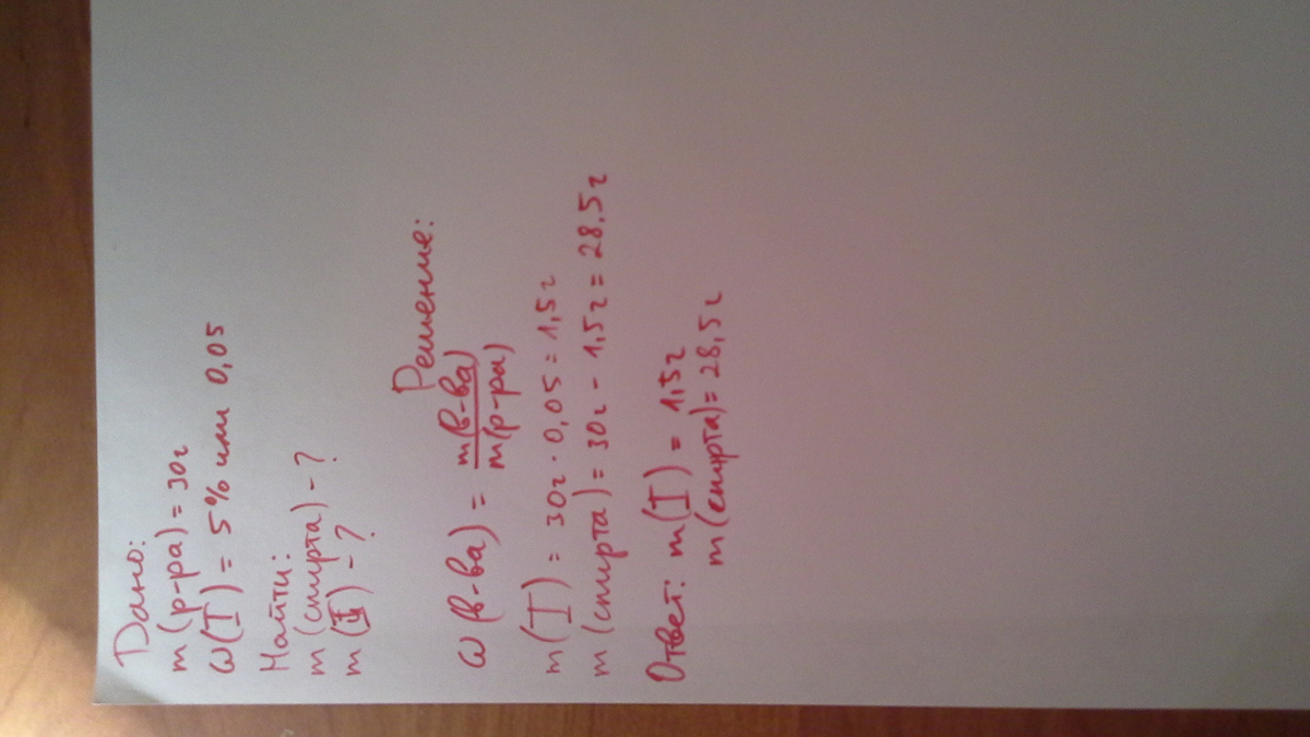 Химия 8 класс. Сколько граммов йода и спирта нужно взять для приготовления 30 г 5%-го раствора йодной настойки?