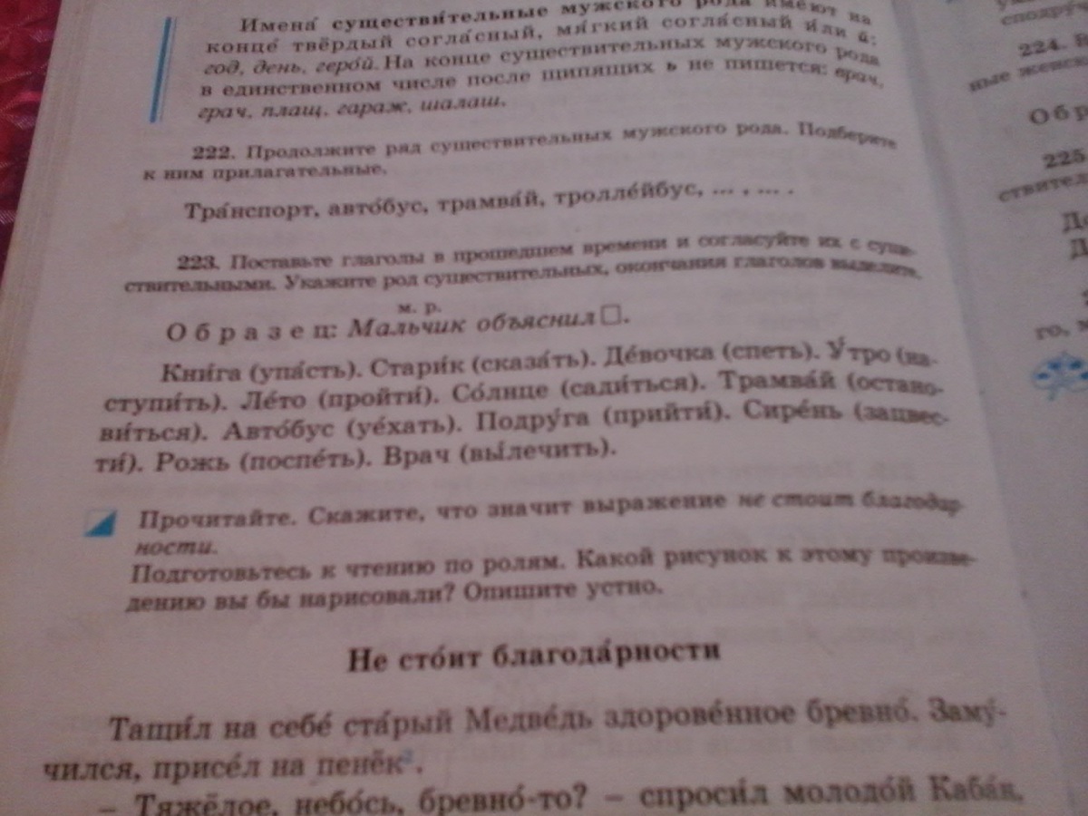 Книга(ж.р.) упал/а. Старик(м.р.) сказал. Девочка(ж.р.) спела. Утро (ср.р.) наступило. Лето(ср.р.) прошло. Солнце(ср.р.) село. Трамвай(м.р.) остановился. Автобус(м.р.) уехал. Подруга (ж.р.) пришла. Сирень(ж.р.) зацвела. Рожь (ж.р.) поспела. Врач (м.р.) вылечил. Окончания везде -о, -а