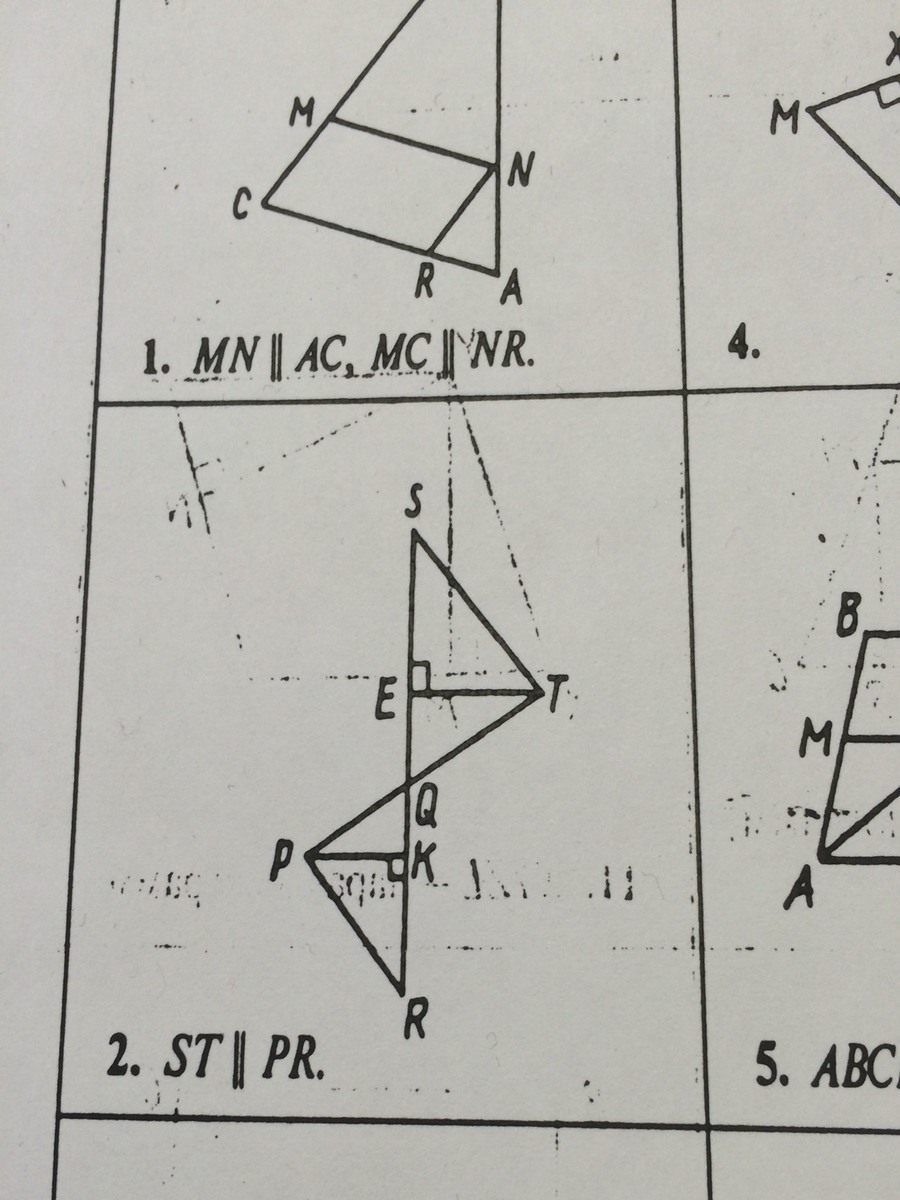 Рассмотрим ΔSET и Δ RKP: угол TSE=углу PRK как внутренние разносторонные при ST|| PR и секущей SR.Тогда ΔSET и Δ RKP -подобные за острым углом.Пропорция SERK = ETKP =STRP