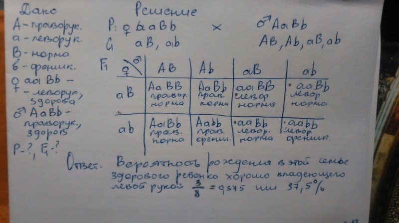 леворукую дочь и сына, который страдает фенилкетонурией. Чему равна вероятность рождения в этой семье здорового ребенка, хорошо владеющего левой рукой? ПОМОГИТЕ НУЖНО СРОЧНОО!!!!!!