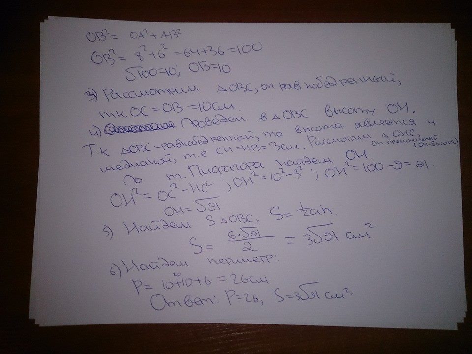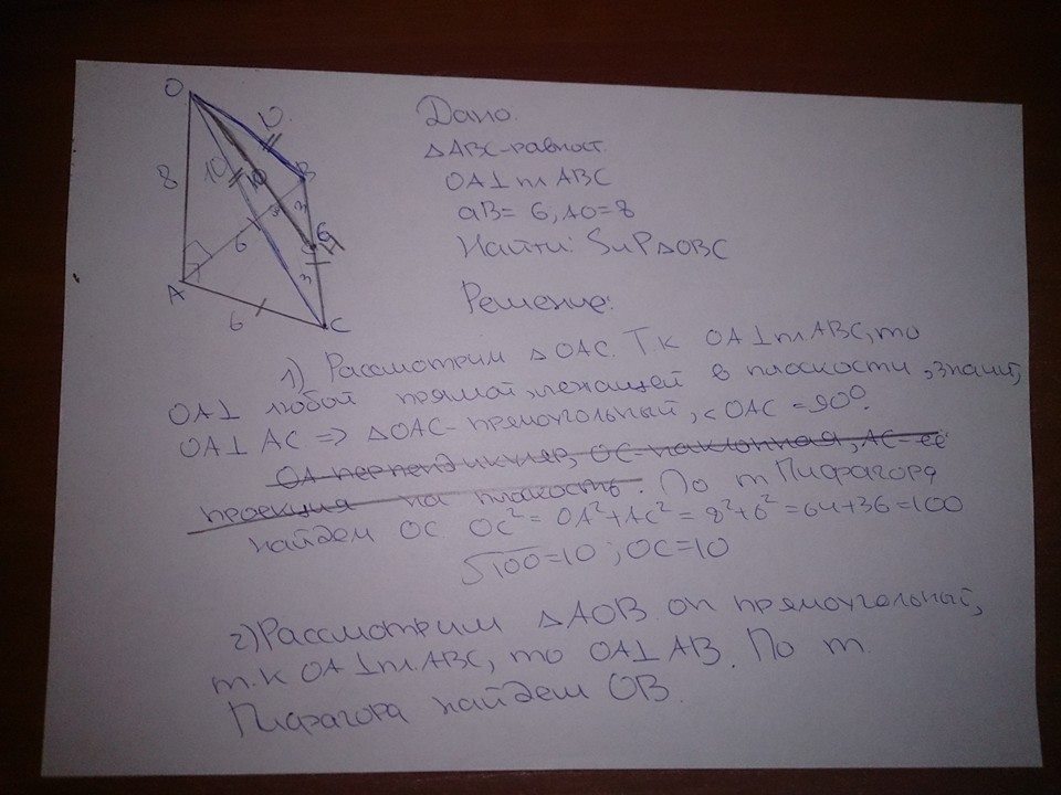 .Помогите.Треугольник abc равносторонний а отрезок ao перпендикулярен к его плоскости.Найдите периметр и площадь треугольника obc если 1ab=6,ao=8 ab=a