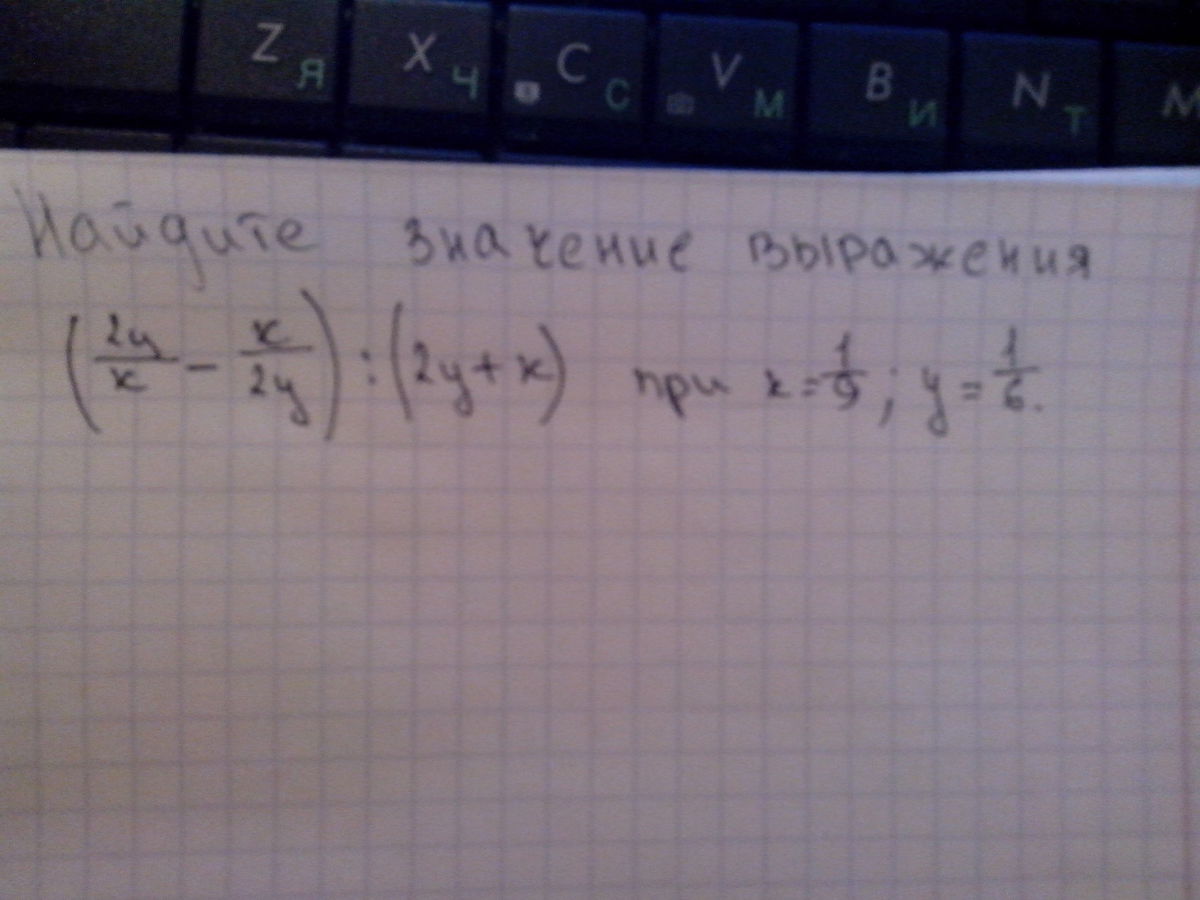 ( frac{2y}{x} - frac{x}{2y} ):(2y+x)= frac{4y^{2}-x^{2}}{2xy} * frac{1}{2y+x} =frac{(2y-x)(2y+x)}{2xy} * frac{1}{2y+x} = frac{2y-x}{2xy}  \ x= frac{1}{9}  \ y= frac{1}{6}  \  frac{2*frac{1}{6}-frac{1}{9}}{2* frac{1}{6}*frac{1}{9}} = frac{frac{2}{6}-frac{1}{9}}{ frac{2}{54}} =frac{frac{4-3}{18}}{ frac{2}{54}} =frac{frac{1}{18}}{ frac{2}{54}} =frac{1}{18}* frac{54}{2} = frac{3}{2} =1,5