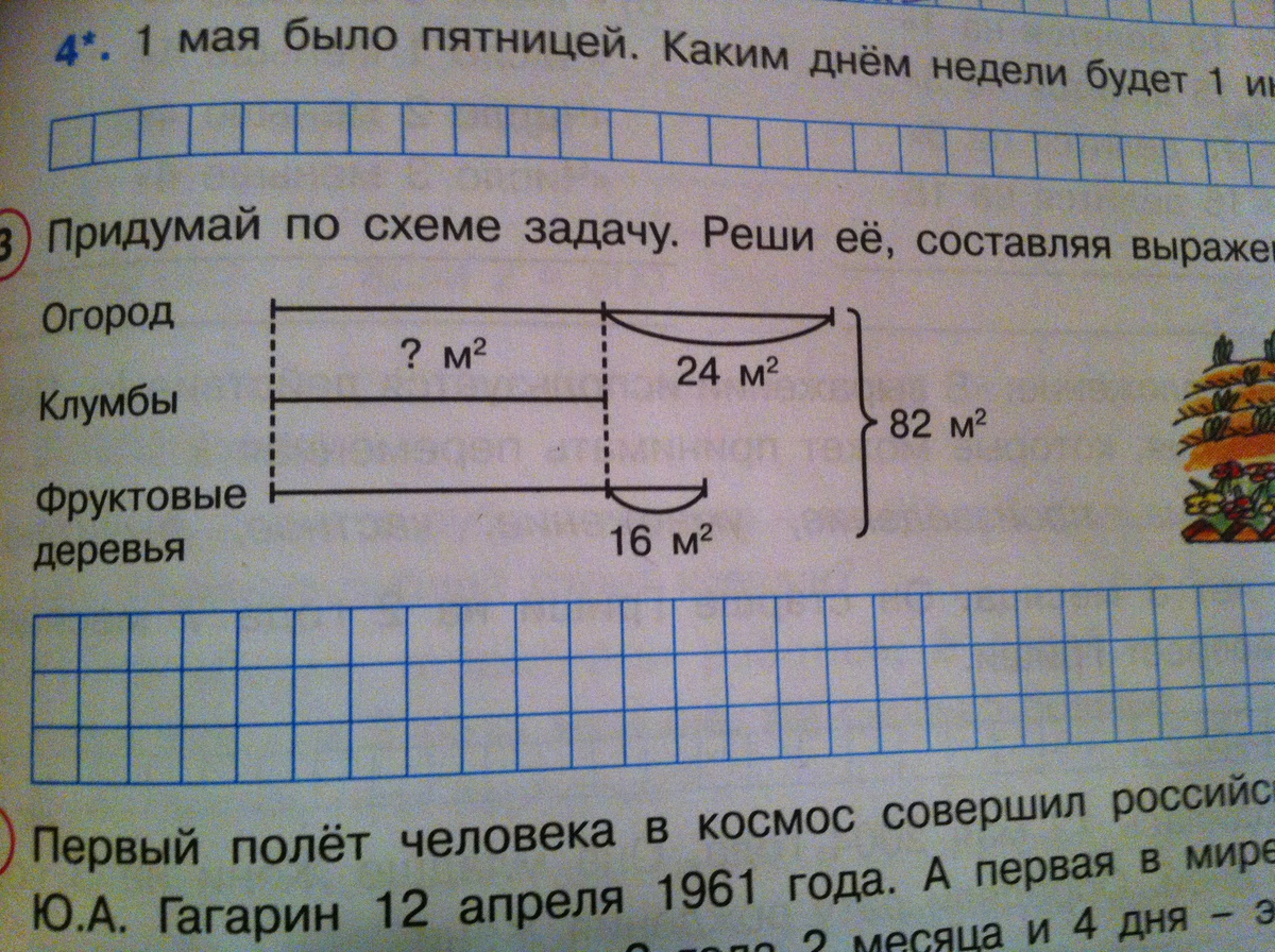 Площадь земельного участка 82 м2. огород занимает 24 м2, фруктовые деревья 16 м2. Узнать какую площадь занимают клумбы?