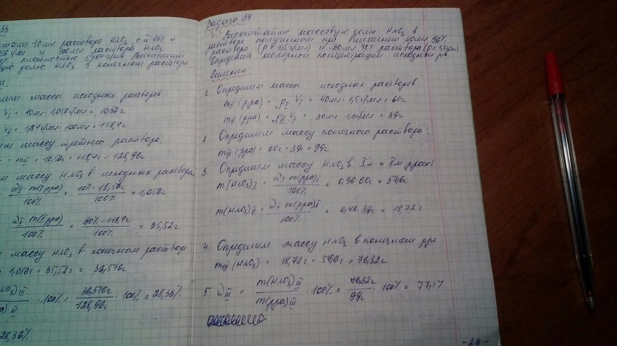 №1. Рассчитайте массовую долю азотной кислоты в растворе полученном при смешении 40 мл 96% раствора азотной кислоты (плотность 1,5 г/мл) и 30 мл 48% раствора азотной кислоты (плотность 1,3 г/мл). Рассчитайте молярные концентрации исходных растворов.