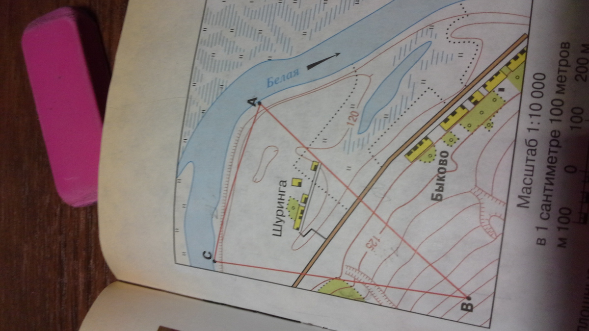 Из пункта С до пункта А нужно пройти вдоль правого берега реки Белая вниз по течению ..... метров. Из точки В в точку А, находящихся на расстоянии ...... метров друг от друга, попадешь, если спустишься вниз по склону, пересечешь автомобильную дорогу и минуешь восточную окраину села Шуринга. Из точки С, расположенной на берегу реки Белая, до точки В нужно подниматься ...... метров по склону в южном направлении, перейдя дорогу, минуя поле с запада и пересекая овраг.