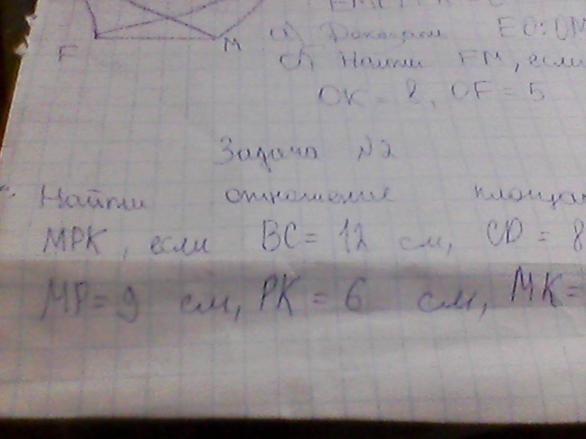 1) Треугольники ЕОК и FOM подобны по двум углам (< FOM=<EOK как вертикальные, а <OEK=<OMF как внутренние накрест лежащие при параллельных ЕК и FМ и секущей ЕМ). Из подобия имеем соотношение ОК/OF=EO/OF, что и требовалось доказать.
