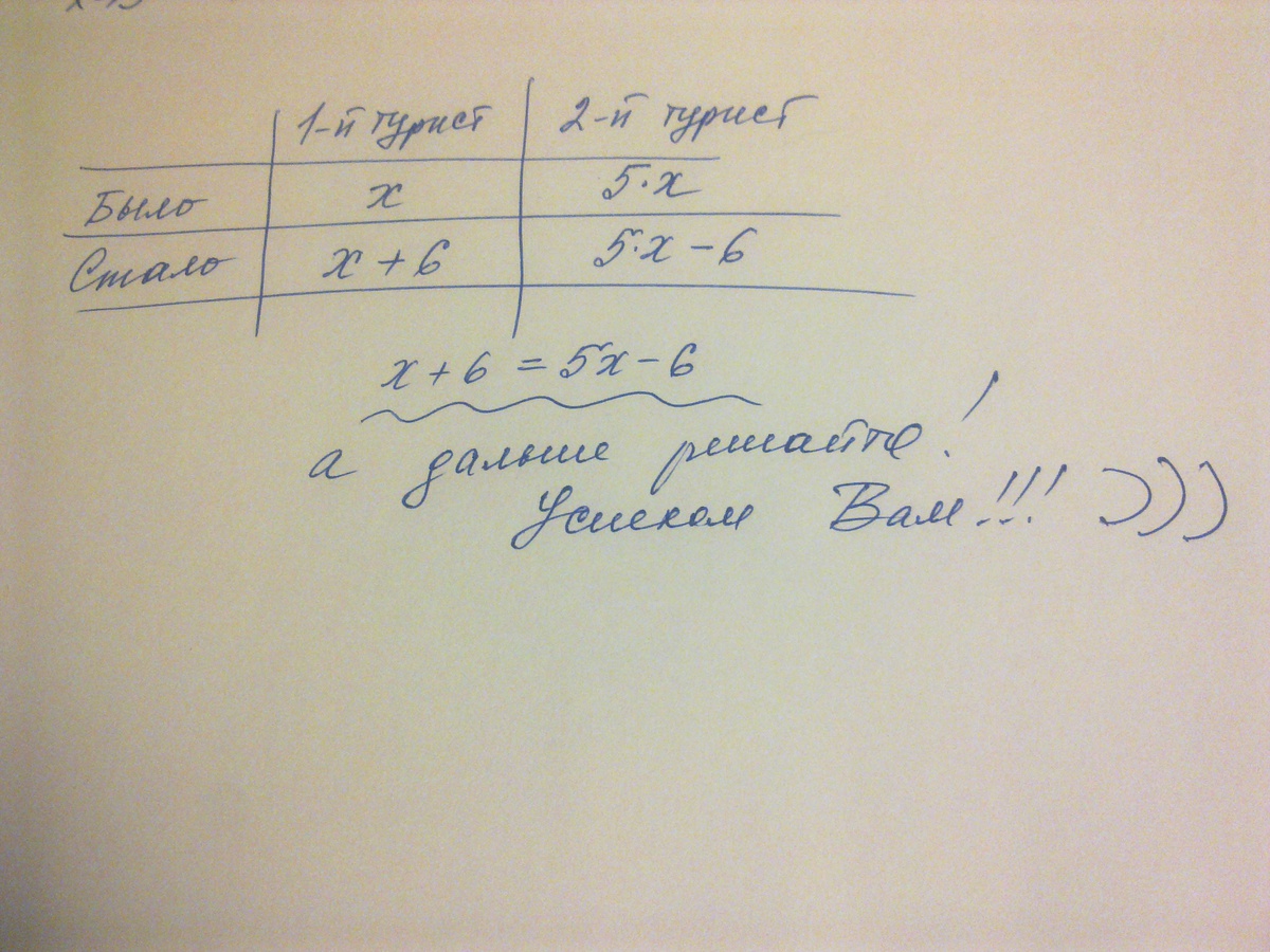 После привала в рюкзаке у одного из туристов оказалось в 5 раз больше продуктов, чем у другого.Для того чтобы уравнять груз, 6 кг продуктов из его рюкзака переложили в рюкзак второго туриста.Сколько килограммов продуктов оказалось в рюкзаках каждого из туристов после привала до перекладывания?