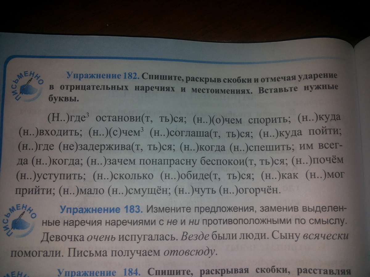негде остановиться, не о чем спорить, никуда не входить, ни с чем не соглашаться, некуда пойти, нигде не задерживаться, никогда не спешить, им всегда некогда, незачем понапрасну беспокоиться, нипочем не уступать, нисколько не обидеться, никак не мог прийти, нимало не смущен, ничуть не огорчён
