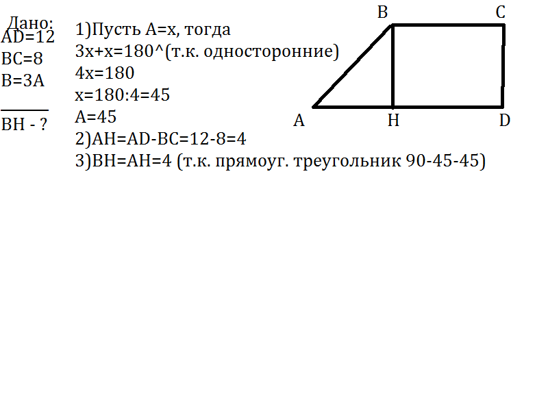 основания прямоугольной трапеции равны 8 и 12см,а тупой угол в три раза больше острого.найдите высоту трапеции