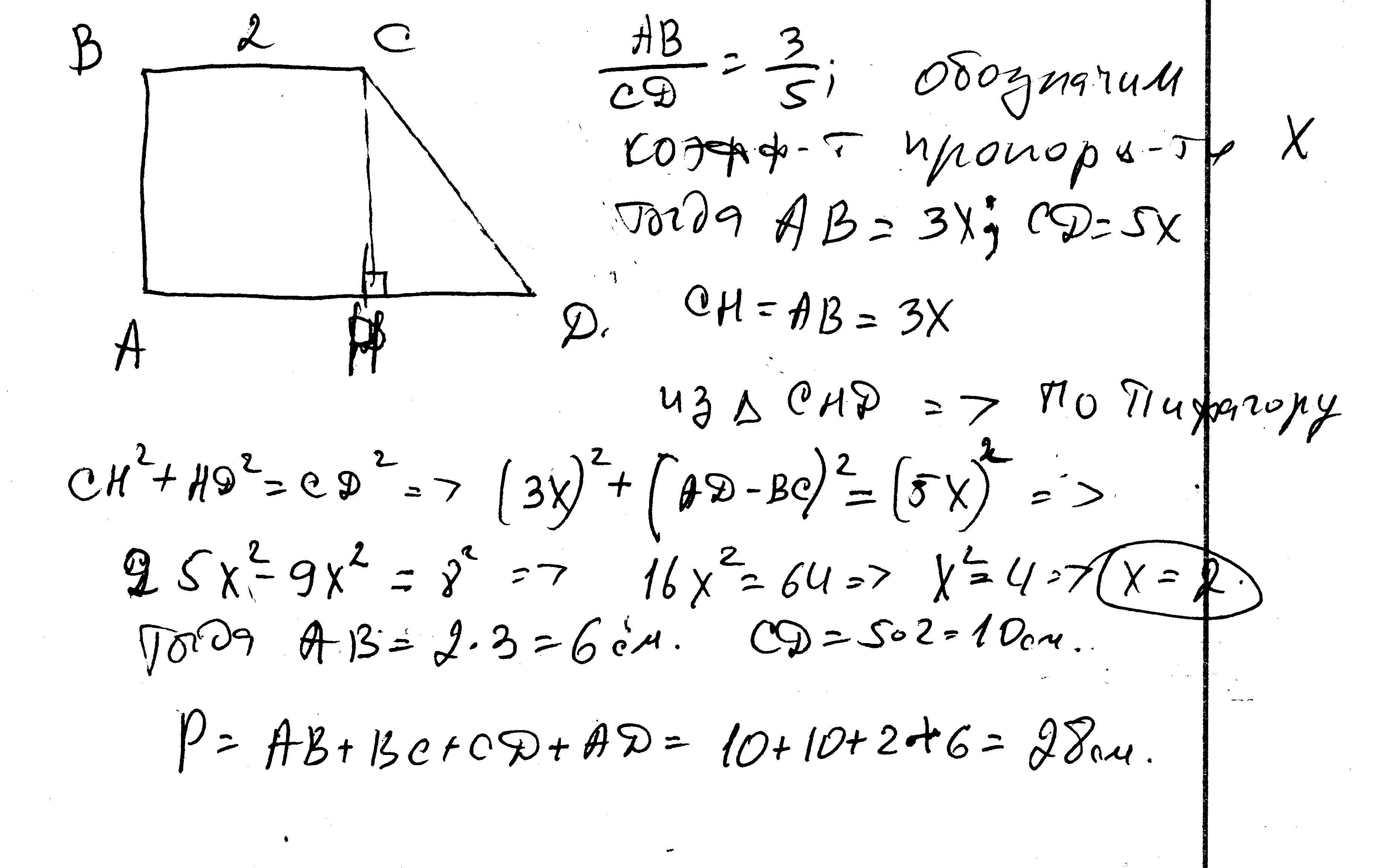 Основания прямоугольной трапеции равны 2 см и 10 см, а боковые стороны относятся как 3:5. Найдите периметр трапеции. Пож решение с объяснением.