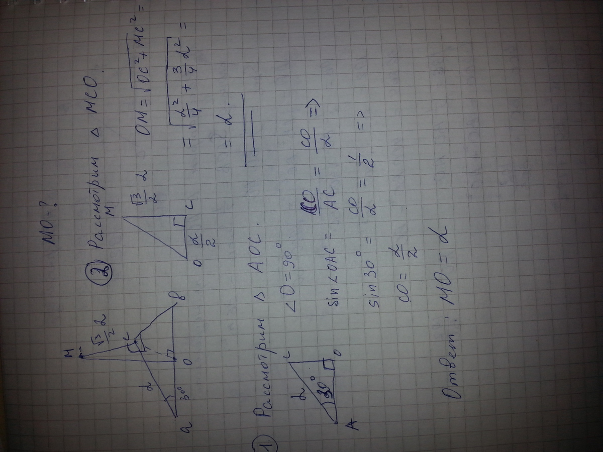 1. Треугольник абс-прямоугольный, с=90 градусов, а=30 градусов, ас=альфа, мс перпендикулярна абс , мс=альфа*корень из 3/2. Найдите расстояние от точки м до прямой аб