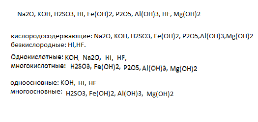 оксид натрия-основный оксид. гидроксид калия -основание ( растворимое) . сернистая кислота (кислородсодержащая, многоосновная). йодоводородная кислота (одноосновная, безкислородная). гидроксид железа 2 -основание. (нерастворимое). оксид фосфора - кислотный оксид. гидроксид алюминия 3 - основание (нерастворимое)