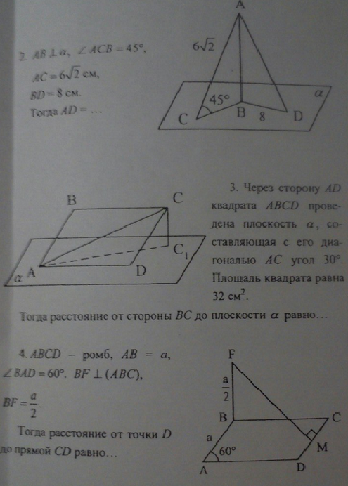 3) есть формула нахождения площади квадрата через диагональ S=d в квадрате 2. подставляем значения и получаем d=8 так как угол напротив перпендикуляра к плоскости (оно же расстояние) равен 30 то растояние будет равно 4