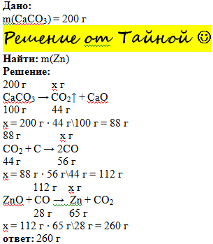 Углекислый газ, полученный из 200 г карбоната кальция, пропустили через избыток раскаленного угля. Образовавшийся угарный газ подействовал на нагретый оксид цинка. Найдите массу полученного цинка. С решением, пожалуйста.