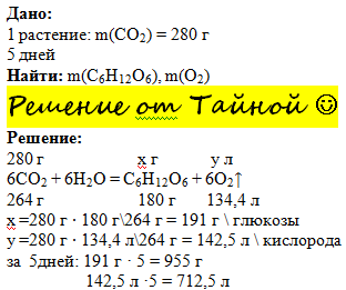В процессе фотосинтеза одно растение поглощает 280 г СО2 в день.Сколько образуется в листьях глюкозы и выделится кислорода за 5 дней?