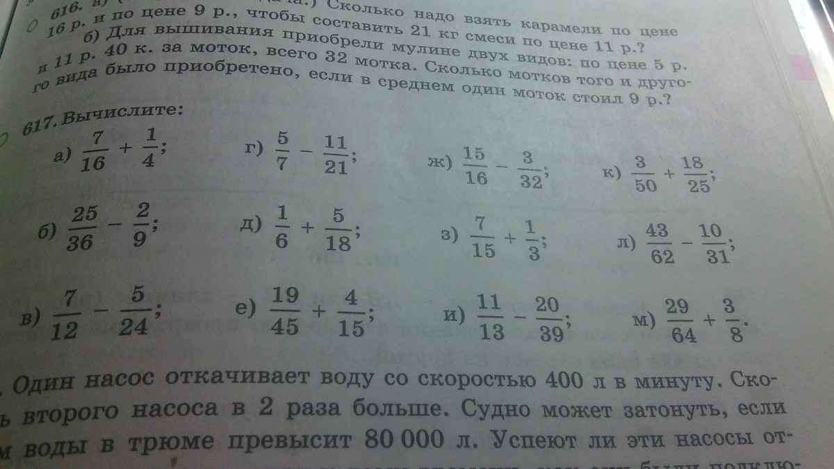 1) frac{7}{16} + frac{1}{4} = frac{7}{16} + frac{4}{16} = frac{11}{16}  \  \ 2) frac{25}{36} - frac{2}{9} = frac{25}{36} - frac{8}{36} = frac{17}{36}  \  \ 3) frac{7}{12} - frac{5}{24} = frac{14-5}{24} = frac{9}{24} = frac{3}{8}  \  \ 4) frac{5}{7} - frac{11}{21} = frac{15-11}{21} = frac{4}{21}  \  \ 5) frac{1}{6} + frac{5}{18} = frac{3}{18} + frac{5}{18} = frac{8}{18} = frac{4}{9}  \  \ 6) frac{19}{45} + frac{4}{15} = frac{19+12}{45} = frac{31}{45}
