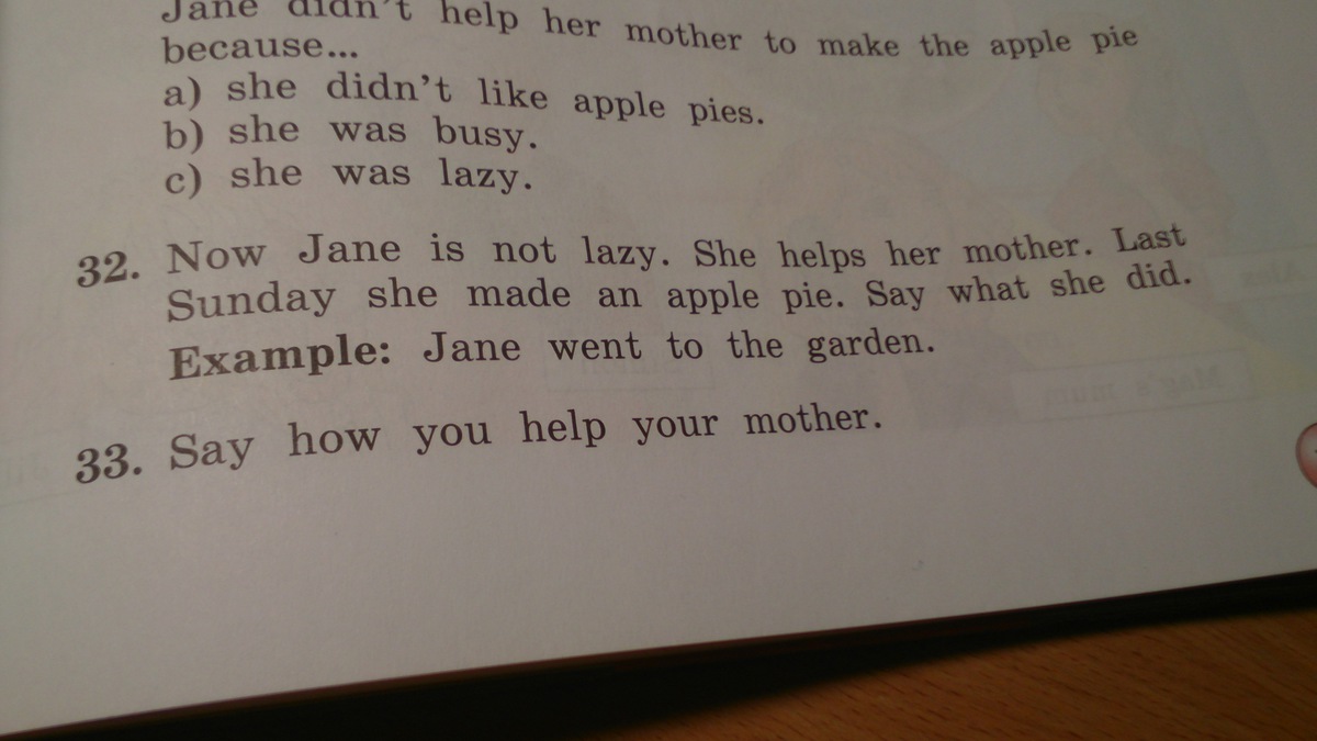 Теперь Джейн не ленива. она помогает своей маме. В прошлое воскресенье она приготовила яблочный пирог. Скажите, что она сделала.