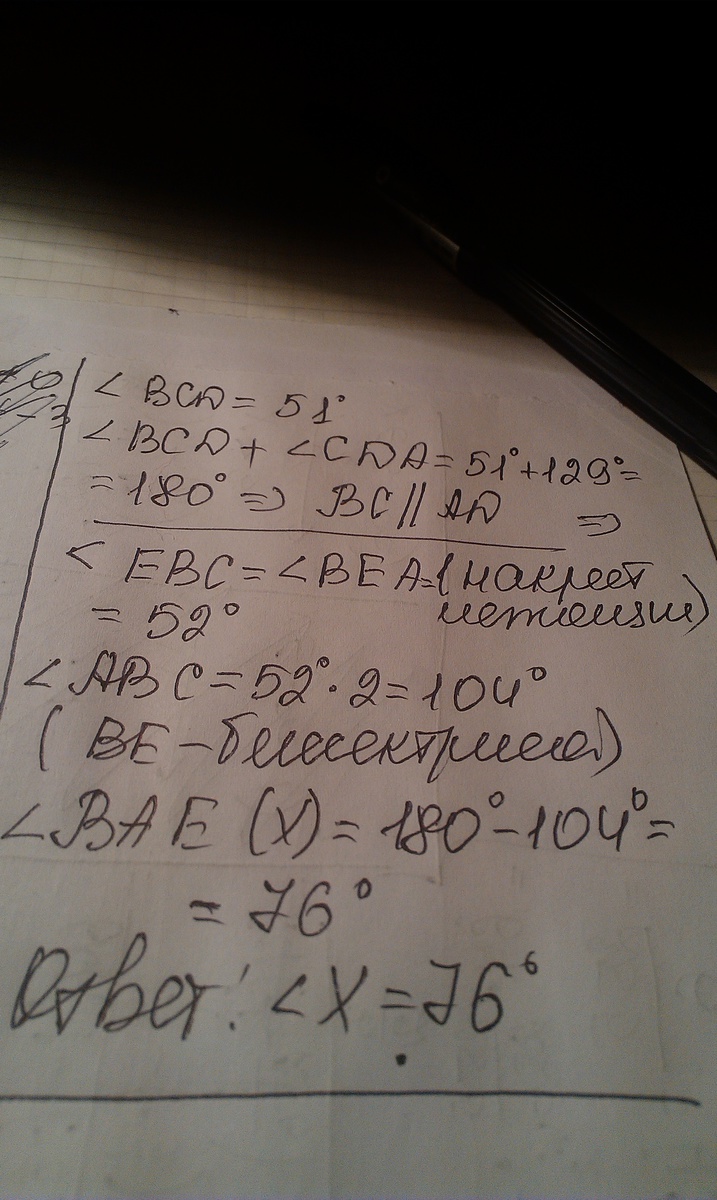 Огромное спасибо.вот только скажите мне пожалуйста когда уже последнее действие ну находим когда угол х,от 180 отнимаем 104.а почему от 180???потому что сумма односторонних углов равна 180 градусов?