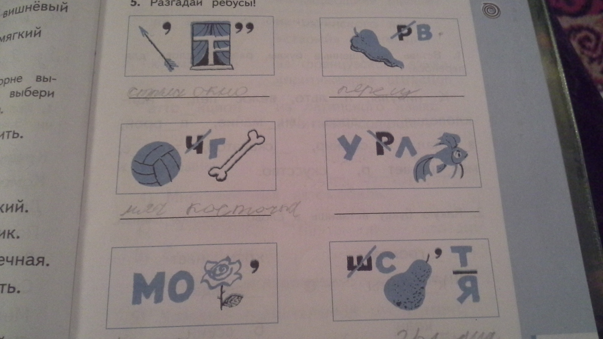 разгадай ребусы мяч-косточка, стрела- окна,перец-В, У-Л-РЫБА, С- ГРУЩА-Т-Я