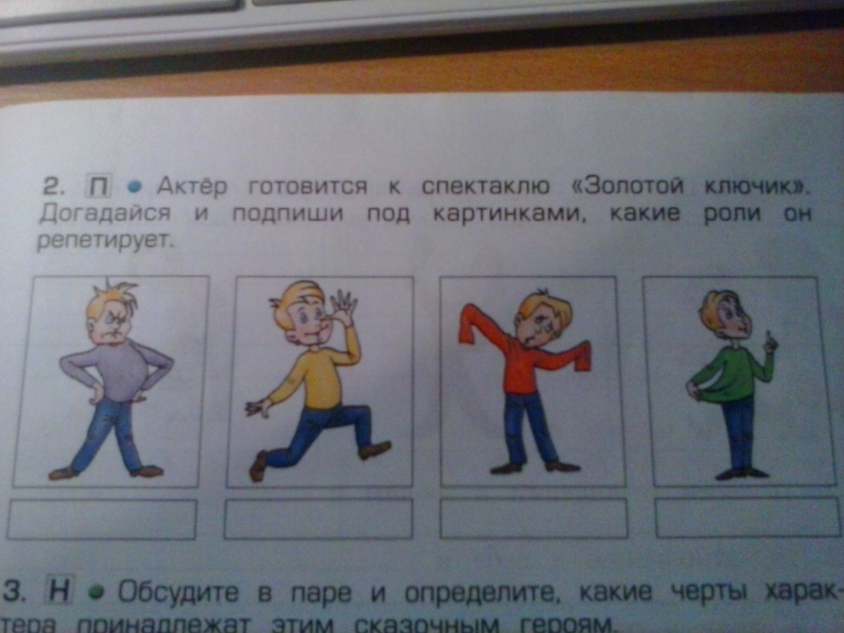 актер готовится к спектаклю золотой ключик догадайся и подпиши под картинками,какие роли он репетирует