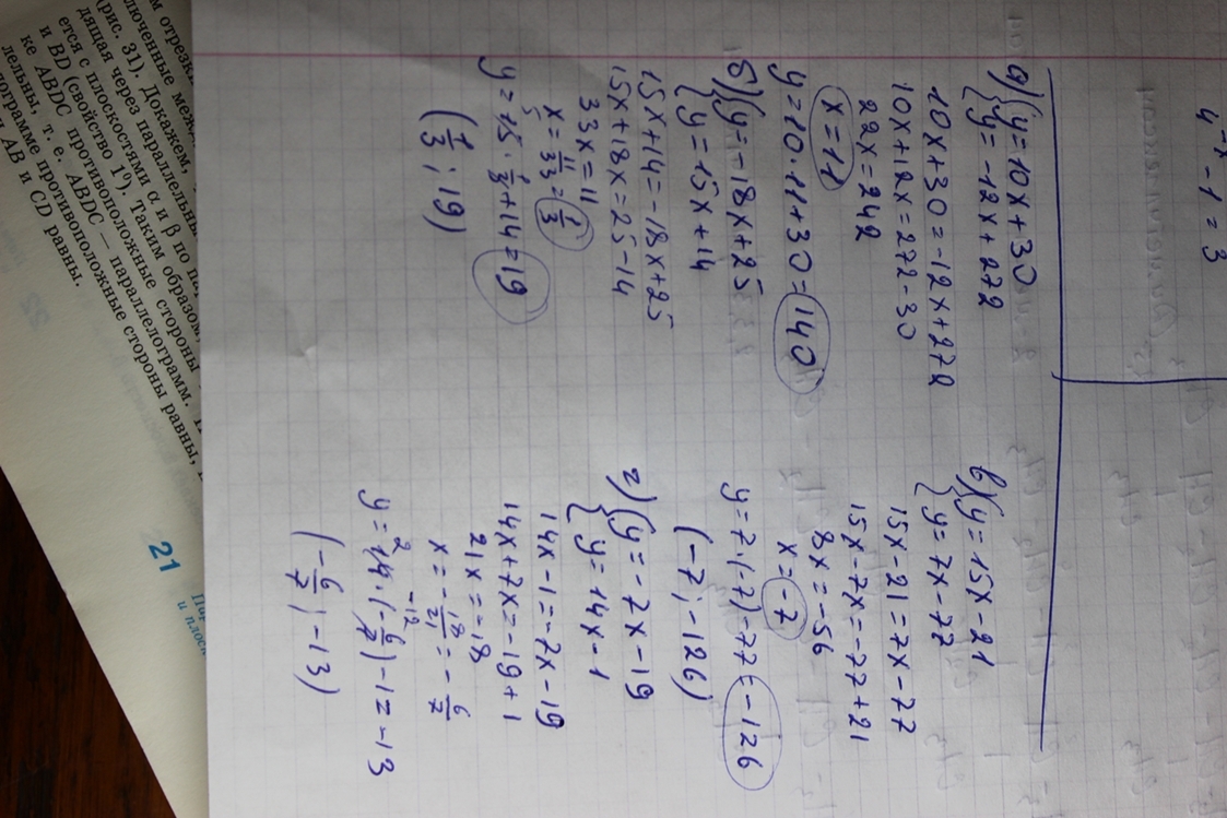 б)y=-18x+25 и y=15x+14 в)y=15x-21 и y=7x-77 г)y=-7x-19 и y=14x-1