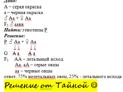 У овец доминантная серая окраска,рецесcивная,гомозиготное состояние ведёт к недоразвитию желудка и к летальному исходу,скрестив двух гетерозиготных овец, определить генотипы потомков и будут ли летальные исходы?