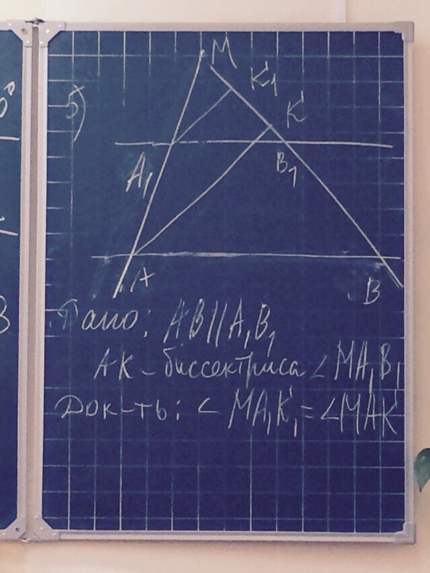 Не смотри на линию МБ есть две паралельные линии АВ и А1В1 кототорые пересекает прямая МА следовательно образовавшиеся углы МА1В1=углу МАВ а биссектриса проходит так что делит угол на две равные части то следовательно и угол МА1К1 равен углу МАК