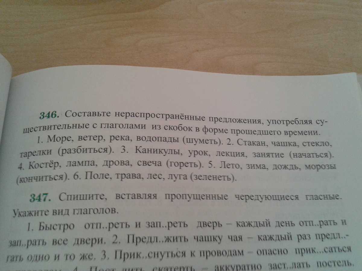 Море шумело. Ветер шумел. Река шумела. Водопады шумели. Стакан разбился. Чашка разбилась. Стекло разбилось. Тарелки разбились. Каникулы начались. Урок начался. Лекция началась. Занятие началось. Костер горел. Лампа горела. Дрова горели. Свеча горела. Лето кончилось. Зима кончилась. Дождь кончился. Морозы кончились.Поле зеленело. трава зеленела. Лес зеленел. Луга зеленели.( Это нераспространенные предложения).