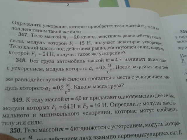 347. а=F1/m1=15/60=0,25 м/с2; m2=F2/a=24/0,25=96 кг;