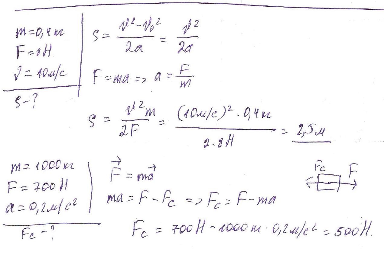1.покоящееся тело массой 400г под действием силы 8Н приобрело скорость 36км/ч. Какой путь при этом прошло тело? 2. Определите силу сопротивления движению, если вагонетка массой 1т под действием силы тяги, равной 700Н, приобрела ускорение ,равное 0,2 м/c в квадрате
