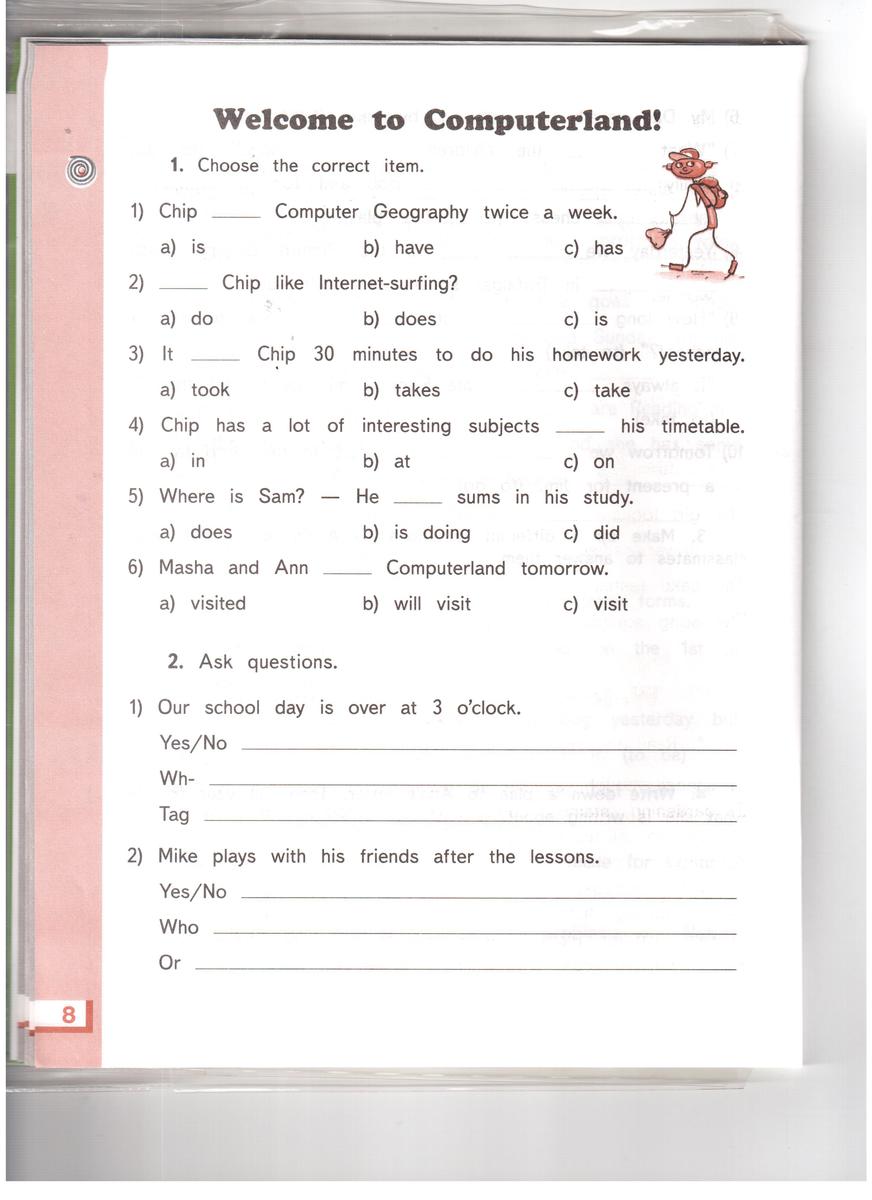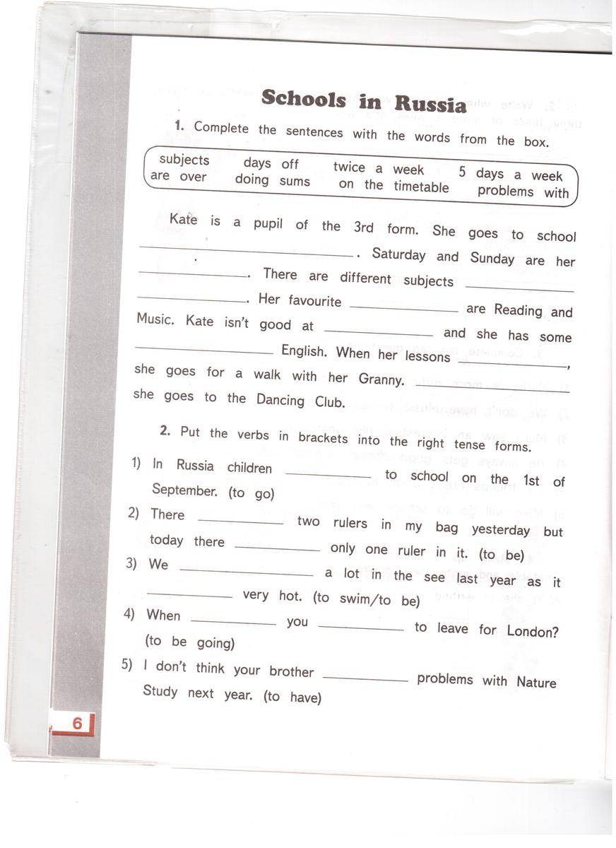 5 days a week / days off / on the timetable / subjects / doing sums / problems with / are over / twice a week.