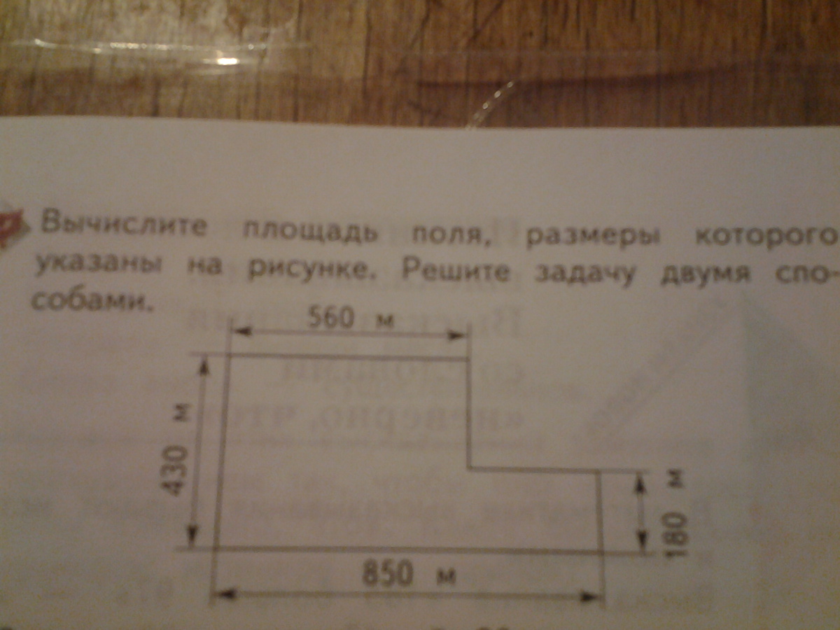 Вычислите площадь поля, размеры которого указаны на рисунке. Решите задачу двумя способами. Рисунок находится снизу там фотография. задачи 2., за 20 минут поезд проходит 18 км. Чему равна скорость поезда? Помогите пожалуйста очень срочно надо решить эти задачи две задачи если это возможно то прямо сейчас!!! Заранее спасибо всем!!!