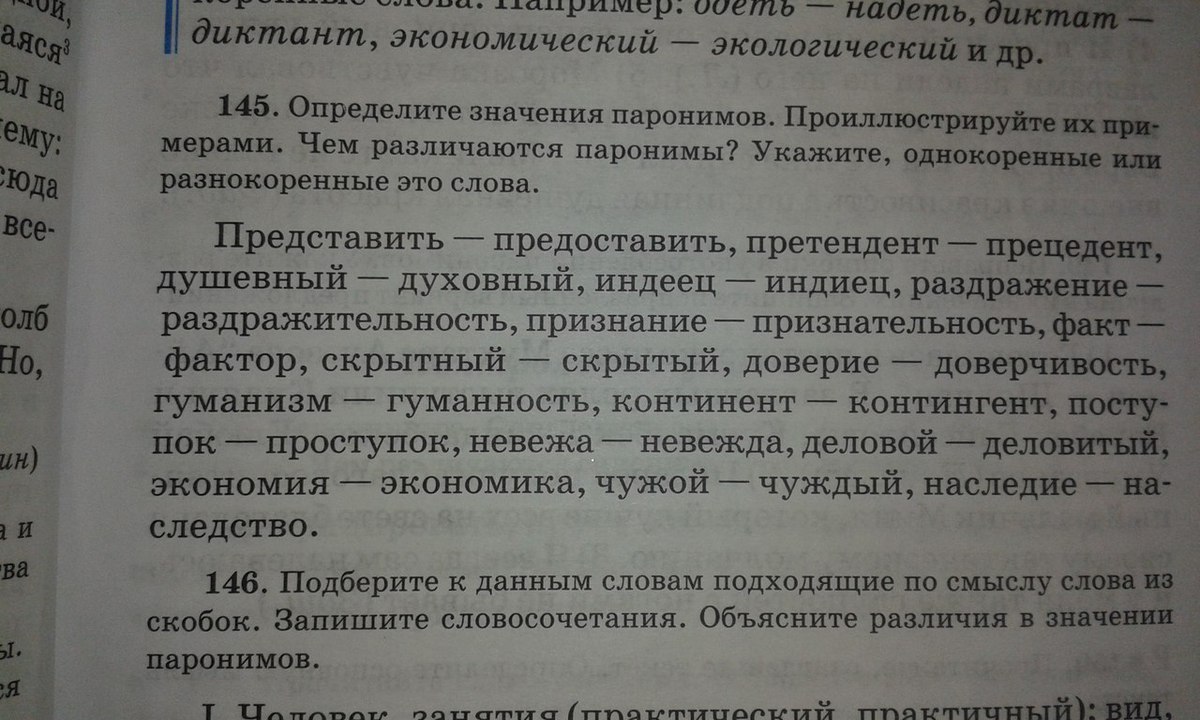 представить документ -предоставить отпуск претендент( тот, который претендует на ч-либо на получение ч-либо) претендент на звание чемпиона, прецедент (случай, имевший место) судебный прецендент поступок мужественный (намеренное действие сделанное кем-то) проступок - (поступок нарушающий законы нормы) плохой проступок, признание таланта, государства, признательность-(чувство благодарности) выразить признательность душевный - искренний сердечный - душевный разговор, потрясение; духовный -внутренний, нравственный мир человека- духовные интересы, но еще и духовная музыка ;деловой связан с делом - деловое письмо , связи; деловитый - умелый предприимчивый толковый - деловитый инженер ;доверчивый человек( легко доверяющий) доверие -заслужить, завоевать терять( убежденность в ч-либо искренности честности) гуманизм ( любовь к человеку, уважение к человеческому достоинству) - современный, данной эпохи; гуманность ( проявление уважение к личности, любовью) гуманность обращения; индеец- племя в Америке - коренные индейцы ; индиец -население Индии, раздражение - состояние возбуждения, чувство недовольства - говорить в раздражении, раздражительность - быстро приходящий в разражение- говорить в раздражительном тоне , скрытный ( скрывающий свои мысли чувства намерения) - скрытный человек, скрытность - отсутствие огласки, сохранение тайне) скрытность характера __ континент - часть суши -большой континент ; контингент - группа людей определенная категория - контингент учащихся невежда -необразованный человек, невежа - грубый невоспитанный наследие - какое-либо явление культуры, быта полученное от предыдущих эпох, поколений - творческое наследие Пушкина ; наследство -имущество, остающееся после смерти к-либо - большое наследство экономия -расчетливость, бережливость - берегла в целях экономии денег экономика - это и научная дисциплина, и народное хозяйство - экономика Севера, изучаем на факультете экономику, преподаватель экономики; чужой - принадлежащий другому - чужие вещи, чуждый - имеющий мало общего с кем-либо или с чем-либо) мне чужды некоторые вещи