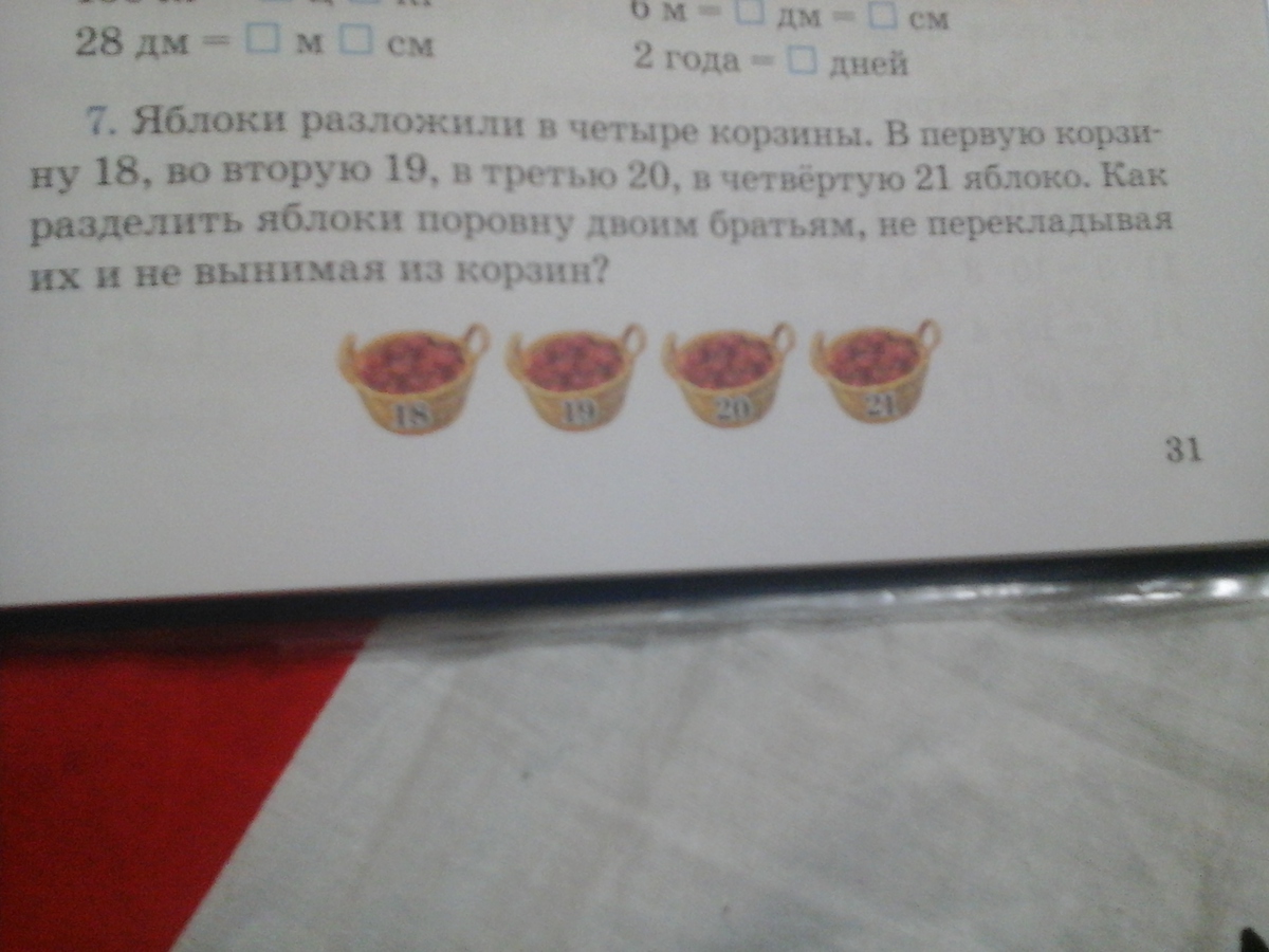Ответ:одному брату дать корзину с 18 и 21 яблоками,а другому с 19 и 20.