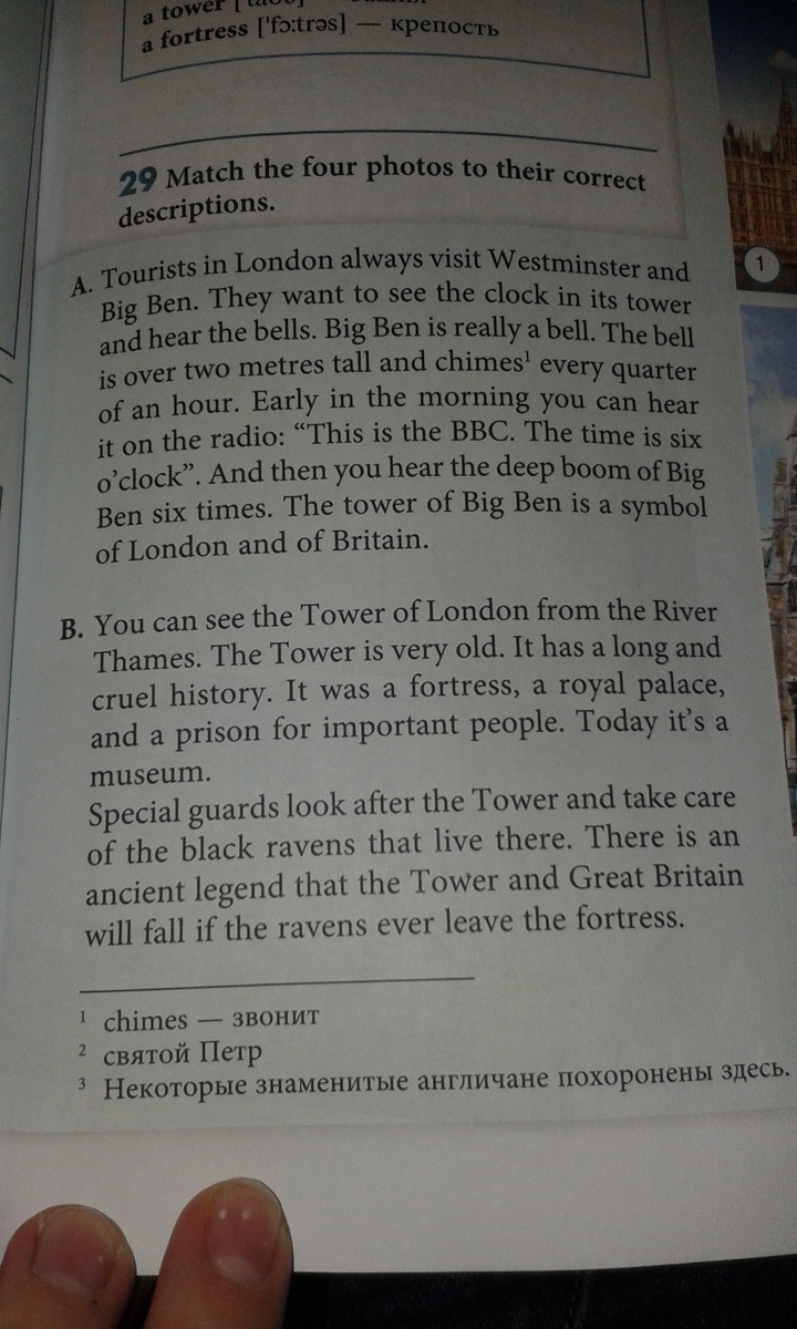 Туристы в Лондоне всегда посещают Вестминстер и Биг Бен. Они хотят увидеть часы на его башне и услышать колокола. Биг Бен — это действительно колокол. Колокола высотой более 2х метров и звонят каждые четверть часа. Рано утром вы можете услышать по радио: «Это БиБиСи. Время 6 часов». И потом вы слышите 6 раз сильный гул Биг Бена. Башня Биг Бен — это символ Лондона и Британии