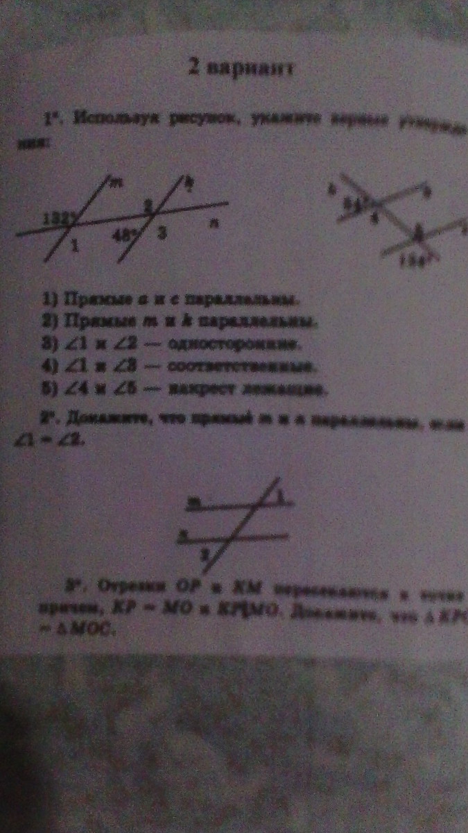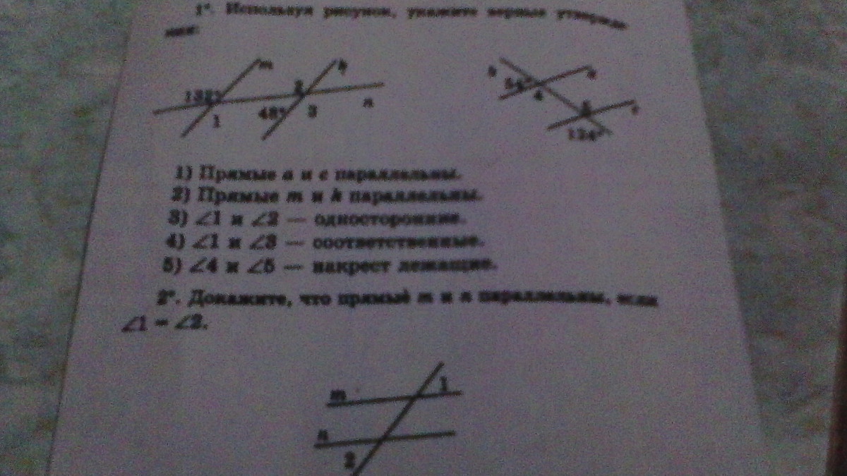 Задание №2. Докажите, что прямые m и n параллельны, если угол 1 равен углу 2(фото 2)