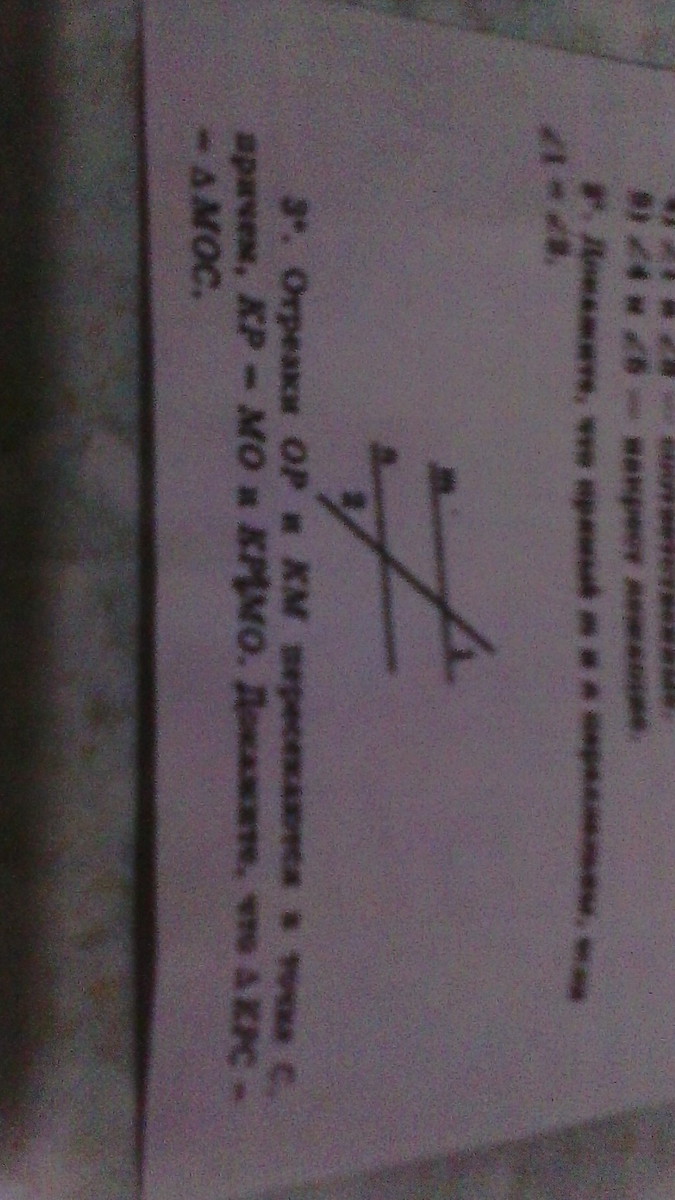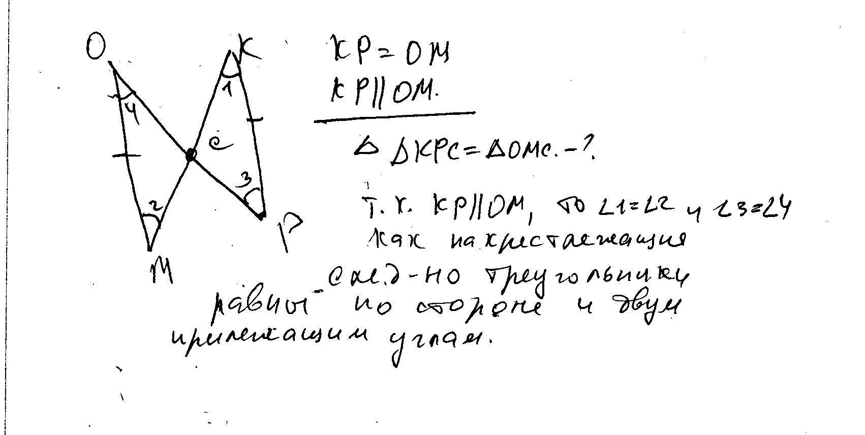 Задание №3. Отрезки OP и KM пересекаются в точке С, причём, KP = MO и KP ll MO. Докажите, что ΔKPS=ΔMOC. (Без фото)