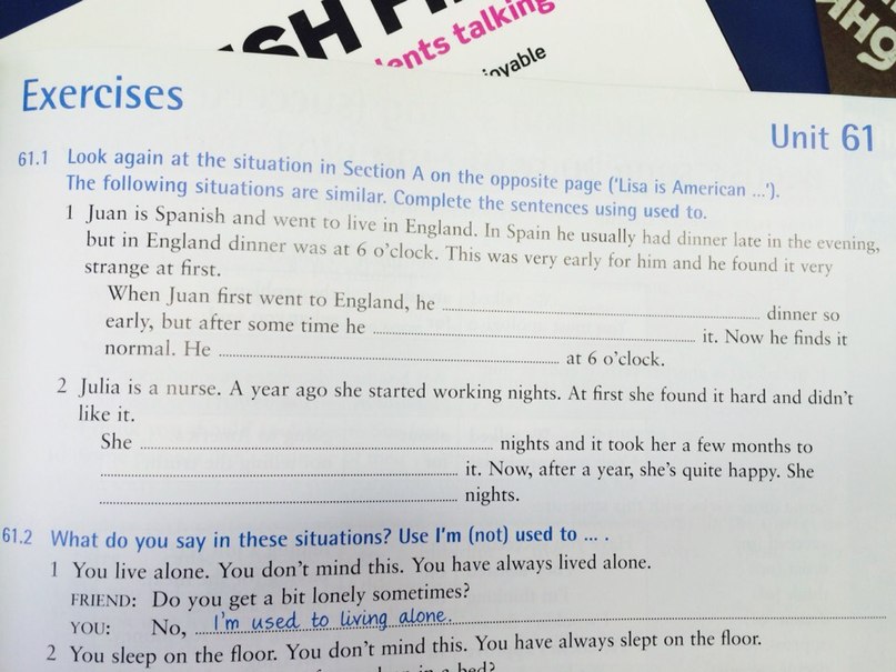 61.1. 1) When Juan first went to England , he wasn't used to having dinner so early, but after some time he got used to it. Now he finds it normal. He is used to eating at 6 o'clock.