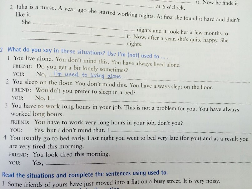 2) She wasn't used to working nights and it took her a few months to get used to it. Now, after, a year, she's quite happy. She is used to working nights.